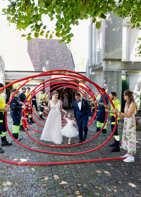 Natürlich durfte die Feuerwehr Wädenswil bei diesem besonderen Anlass nicht fehlen. Gemeinsam mit einigen AdF der Feuerwehr Horgen bildeten die Kameradinnen und Kameraden nach der Trauung ein festliches Spalier aus Schläuchen, begleitet von den Sirenen der Einsatzfahrzeuge.